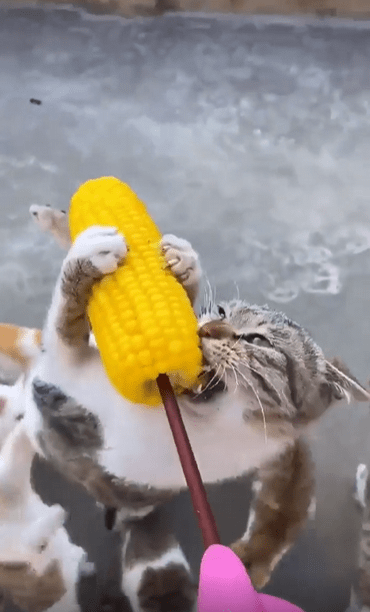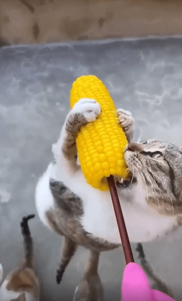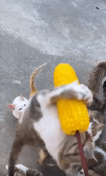 그러던 찰나, 고양이 무리 중 한 마리가 갑자기 튀어 오릅니다. 전혀 망설임 없는 점프, 앞발도 펼치지 않고 오직 입 하나에 모든 걸 건 채, 옥수수를 향해 돌진합니다. 그리고 그 순간—덥썩. 고양이는 허공에서 옥수수를 정확히 물어버립니다. 착지할 생각도 없습니다. 놀랍게도, 그 고양이는 공중에 떠 있는 채로 옥수수를 물고 그대로 ‘냠냠냠’을 시작합니다.
