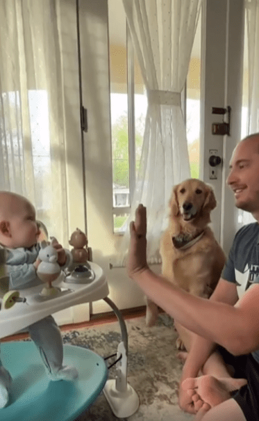 따스한 오후 햇살이 비치는 거실 한가운데. 아빠와 아기가 마주 앉아 있습니다. 아빠는 환한 얼굴로 아기에게 손을 들어 보이며 “하이파이브~”를 반복해 보여줍니다. 아기의 작은 손은 아직 동작을 따라 하기에는 어설퍼 보입니다. 아빠는 웃으며 계속해서 손을 내밀고, 응답을 기다리죠. 이 모든 과정을 조용히, 그러나 매우 진지하게 지켜보는 또 다른 존재가 있습니다. 바로 옆에 앉아 있는 골든 리트리버입니다.