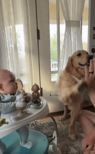 넓은 등과 부드러운 금빛 털을 가진 이 강아지는 아빠의 손짓과 목소리를 가만히 바라보고 있습니다. 귀는 앞으로 향해 있고, 눈은 손끝을 따라가며 빛납니다. 아빠가 다시 한번 아기에게 하이파이브를 외치며 손을 들자, 골든 리트리버의 앞발이 슬그머니 들썩입니다. 한두 번 그러는가 싶더니, 아빠의 동작이 반복될 때마다 앞발이 점점 더 올라오고, 몸 전체가 손짓에 반응하고 있음을 알 수 있습니다.