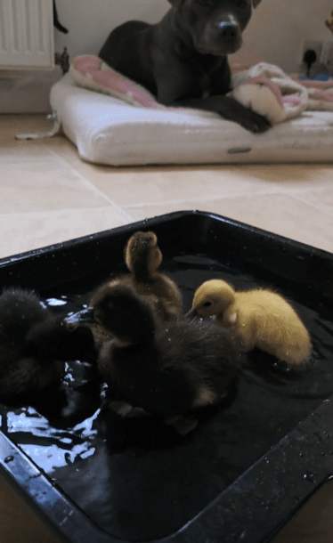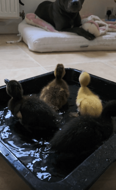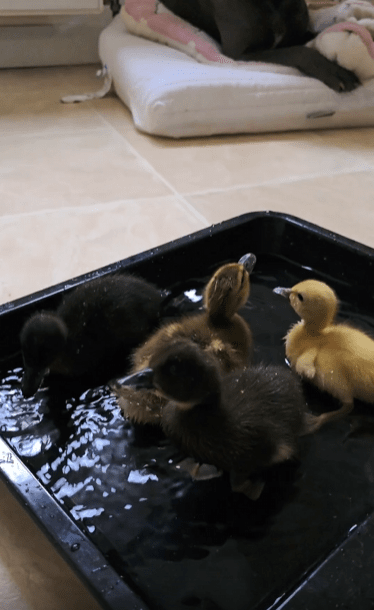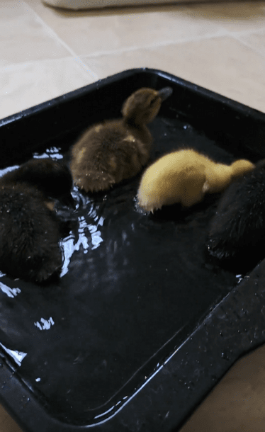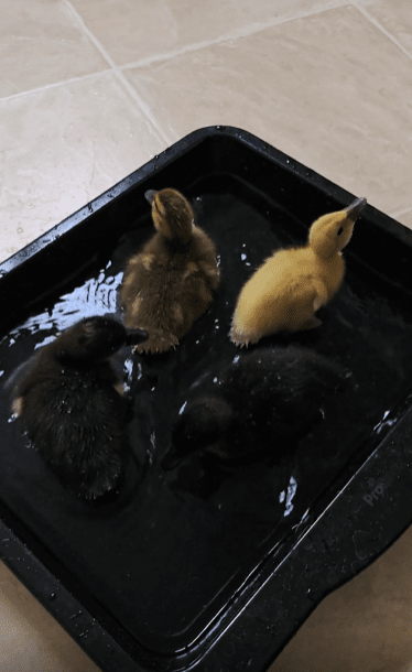 부엌 한켠, 보통은 요리를 위해 꺼내 놓는 로스팅팬 하나. 반짝이는 금속 바닥 위엔 물이 담겨 있고, 그 안에는 예상 밖의 손님들이 살금살금 헤엄치고 있습니다. 바로, 갓 태어난 듯한 부드러운 솜털을 가진 새끼 오리 네 마리. 노란빛과 갈색이 섞인 작은 몸은 물 위에 동그랗게 떠 있고, 네 마리는 서로 옆구리를 맞대며 작고 좁은 수면 위를 분주히 움직이고 있습니다.