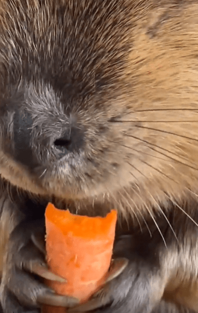 비버의 손은 마치 사람처럼 섬세했어요. 두 손으로 당근을 꼭 쥔 채, 이를 드러내지 않고 앞니로 조용히 파고들었습니다. 한 입 한 입 깨물 때마다 작은 턱이 움찔하고, 입 주변의 털이 살짝살짝 떨리는 모습에선 세심한 집중력이 느껴졌죠. 털복숭이 얼굴 중앙에 자리한 동그란 눈은 아무런 경계심 없이 화면을 향해 열려 있었고, 그 속엔 오로지 '먹는 일' 하나에만 집중하는 순수함이 담겨 있었습니다.