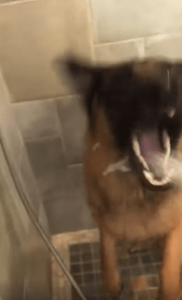 하지만 시선이 반대편으로 옮겨지자 분위기는 완전히 달라집니다. 이번엔 저먼 셰퍼드. 같은 물줄기, 같은 위치지만 반응은 180도 다릅니다. 물이 얼굴 근처에 닿는 순간, 셰퍼드는 눈을 번쩍 뜨고 얼굴을 좌우로 격하게 흔듭니다. 입을 크게 벌려 마치 물을 향해 싸우듯 달려들죠. 마구 깨무는 듯한 동작과 물줄기를 박살내려는 듯한 그 기세—그야말로 "물과의 한판 승부"였습니다.