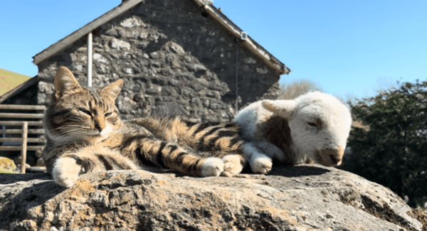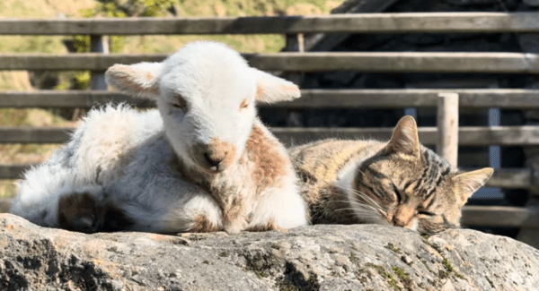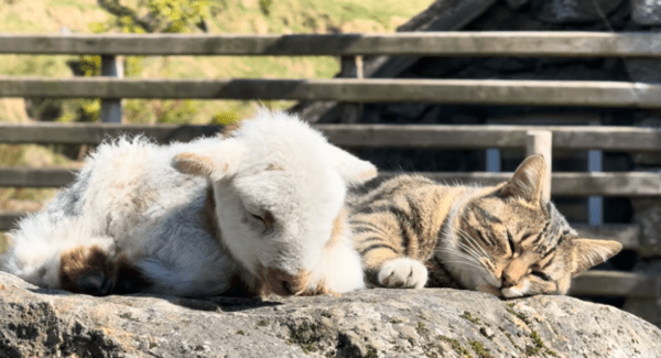 따뜻한 햇살이 내려앉은 어느 오후, 실외의 작은 돌 위에 고양이 한 마리와 어린 양이 나란히 앉아 있었습니다. 마치 오래전부터 서로 알고 지낸 친구처럼, 말도 없이 조용히 같은 방향을 바라보며 느긋하게 시간을 보내는 모습이었죠. 따로 놀지도 않고, 딱히 장난을 치는 것도 아닌데, 그 둘 사이에는 묘한 평화가 흐르고 있었습니다.