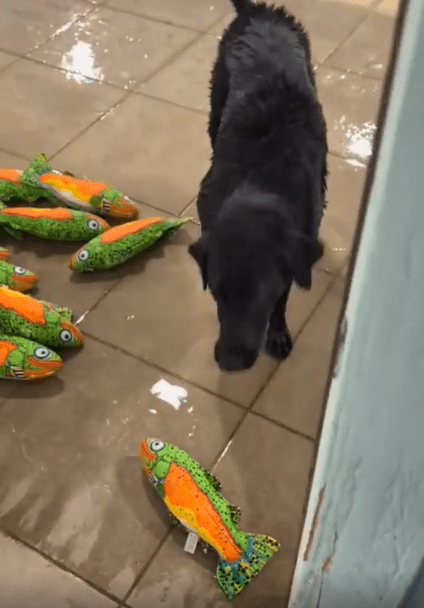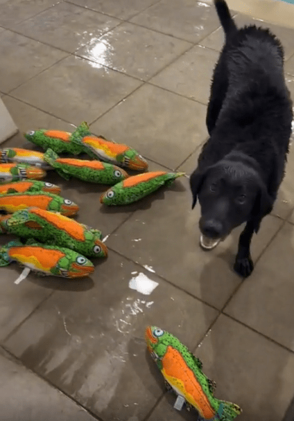 출처 : Reddit /  주인이 문을 열자  장난감 물고기들과 강아지가 있다