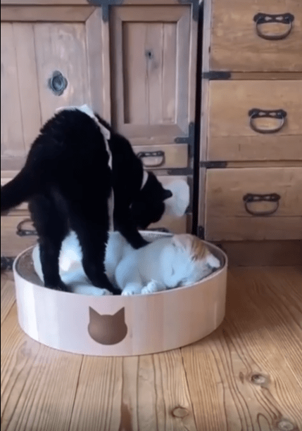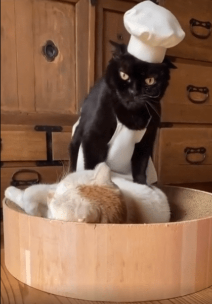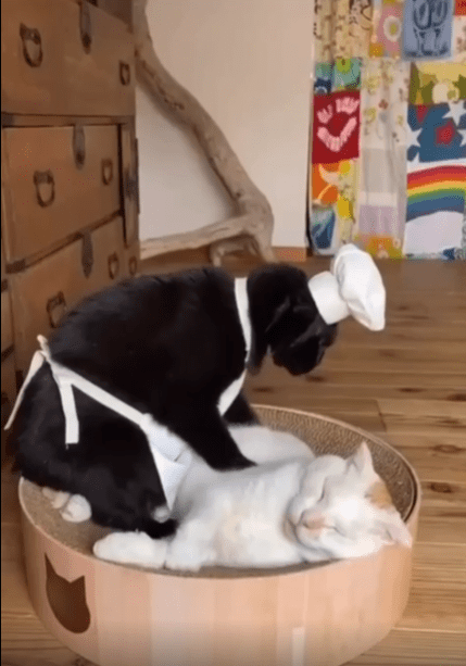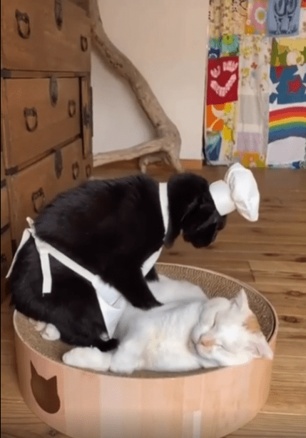 출처 : Reddit / 제빵모자와 앞치마를 두른 검은 고양이가 다른고양이에게 반죽 마냥 꾹꾹이를 하고있다