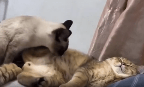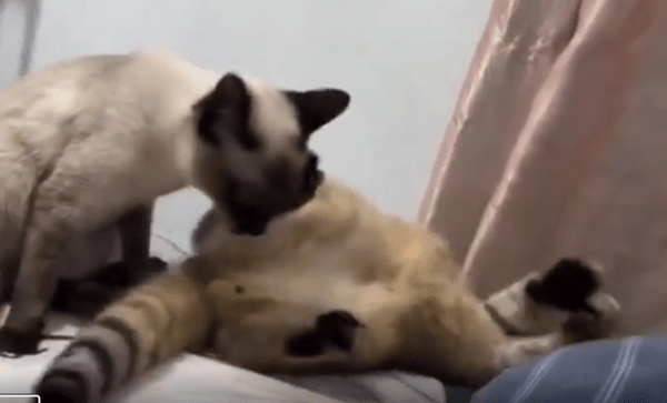 햇살이 비치는 침대 끝자락, 두 마리의 고양이가 조용히 시간을 보내고 있었습니다. 한 마리는 편안하게 등을 바닥에 댄 채 누워 있었고, 다른 한 마리는 정좌 자세로 앉아 조용히 친구를 그루밍해주고 있었죠. 앞발을 움직이지도 않고, 천천히 고개만 숙인 채 부드럽게 핥는 그 모습은 마치 “오늘은 내가 너 챙겨줄게”라고 말하는 듯했습니다.