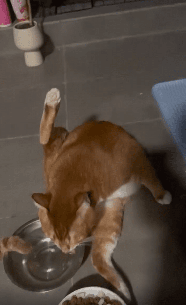 등은 둥글게 말려 있었고, 고개는 깊게 숙여져 있었습니다. 무엇보다 시선을 끄는 건 들려 있는 뒷다리 한쪽. 누가 봐도 “똥꼬 핥기 자세”로 불리는 그 독특한 포즈였죠. 뒷다리는 머리 위까지 들려 있고, 고양이는 그 상태 그대로, 묵묵히 물그릇에 혀를 내밀어 물만 열심히 핥아먹고 있었습니다.