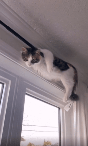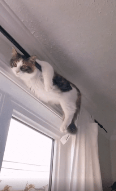 실내 벽과 창문 사이, 높은 곳에 설치된 커튼봉. 대부분의 사람에겐 그저 커튼을 걸기 위한 구조물이지만, 고양이에겐 그 위가 바로 ‘세상의 중심’이 되는 곳입니다.