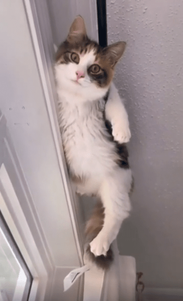 밑에서는 그저 평범한 거실이지만, 고양이의 눈엔 모든 게 한눈에 들어오는 감시탑 같았을 겁니다. 두 앞발은 봉 위에 가지런히 모아놓고, 뒷발과 엉덩이는 절묘하게 벽에 살짝 기댄 채 균형을 잡고 있었죠. 자세는 위태로워 보이지만, 표정은 태연합니다. 오히려 "이 정도는 기본이지"라고 말하는 듯한 그 눈빛.