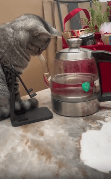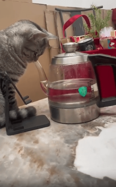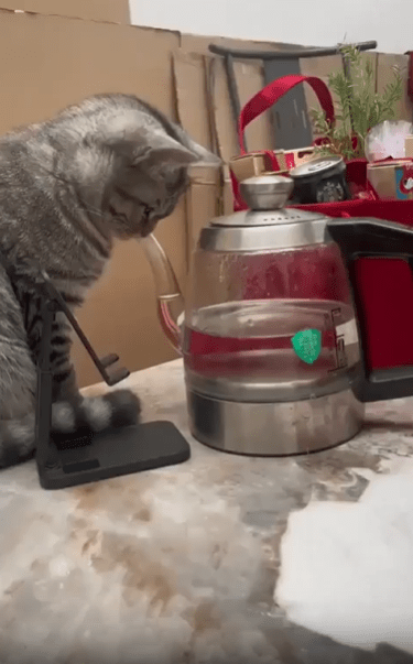주방 한가운데, 유리로 된 주전자 하나가 놓여 있습니다. 그 안엔 깨끗한 물이 담겨 있고, 주둥이는 공중으로 길게 뻗어 있죠. 그런데, 주전자의 앞에 한 마리 고양이가 떡 하니 앉아 있습니다. 그리고 놀랍게도—그 고양이는 물을 마시고 있는 중입니다. 단, 우리가 아는 일반적인 방식은 아니었죠.