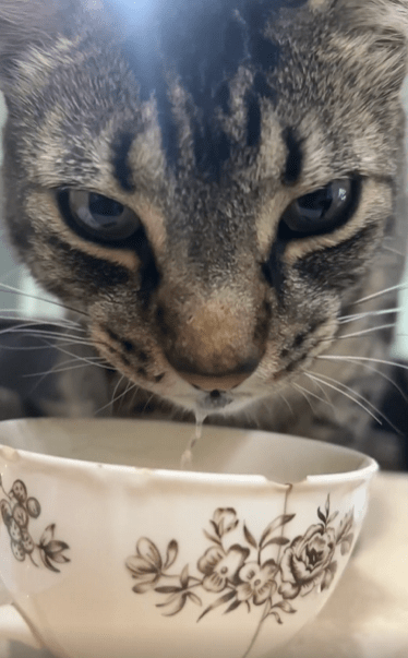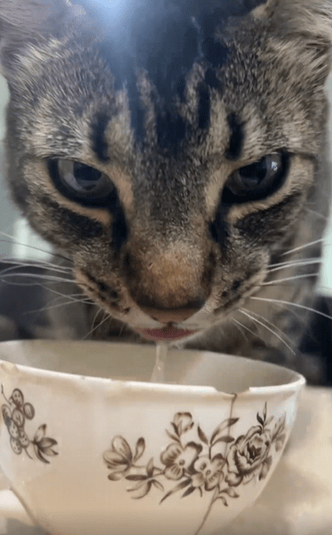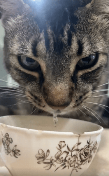 사실 고양이는 평소에도 종종 사람을 뚫어져라 바라보지만, 이처럼 완전히 무표정에 가까운 응시 상태에서 ‘행동’을 병행하는 모습은 꽤 드뭅니다. 그만큼 지금 이 고양이는 한 손엔 수분 보충, 한 손엔 감시 태세를 유지하는 극한의 멀티태스킹을 선보이고 있는 셈이죠.