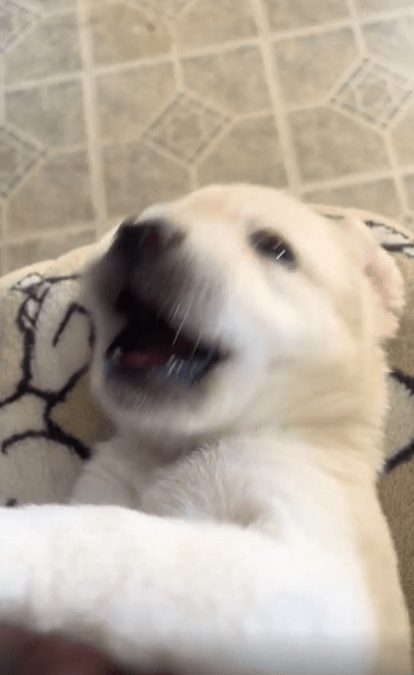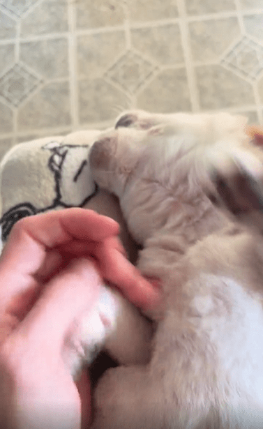 작고 복슬복슬한 흰색 새끼 강아지 한 마리가 등을 대고 누워 있습니다. 다리도 짧고 배도 통통한 이 강아지는 아직 두 달밖에 되지 않은 꼬물이. 그 모습만으로도 충분히 사랑스럽지만, 이 아이가 진짜 존재감을 드러내는 건 주인의 손이 다가올 때부터입니다.