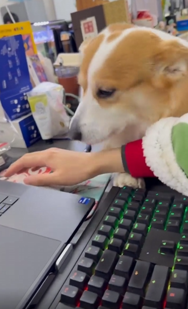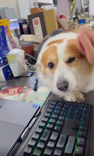 처음엔 조용히 시선을 끌더니, 이내 앞발을 살짝 올리거나 고개를 기울이며 “지금이야, 지금 만져줘야 할 때야”라는 무언의 신호를 보냅니다. 주인은 몇 번 키보드를 더 두드리지만, 강아지의 존재감은 점점 더 선명해지고 결국 손은 자연스럽게 키보드를 떠나 강아지의 머리로 향합니다.