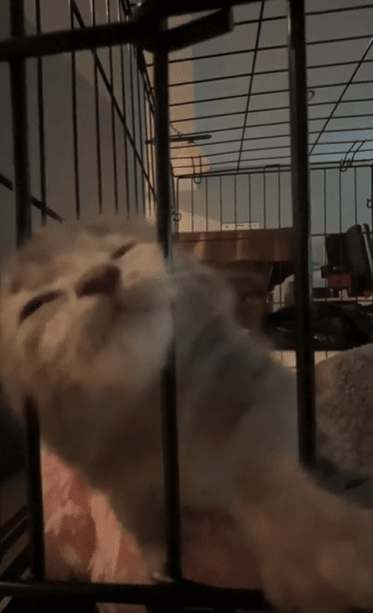 출처 : Reddit / 케이지 철창 사이로 얼굴을 내민채 팔일 휘젓고 있는 고양이