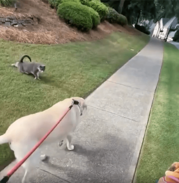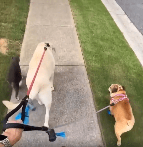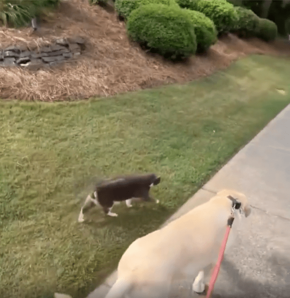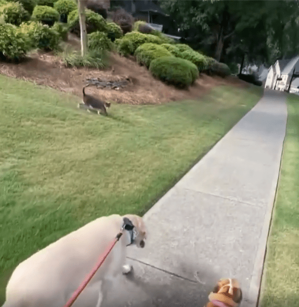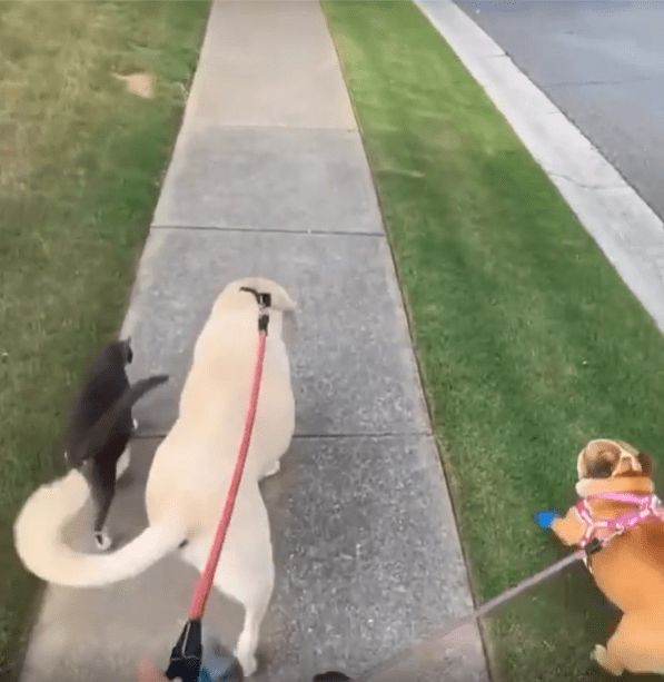 햇살 좋은 길가, 주인이 두 마리의 강아지와 나란히 산책을 하고 있습니다. 강아지들은 리드줄에 매여 있지만 자연스럽게 걷고 있고, 주인의 발걸음에 맞춰 조용히 앞을 따라가고 있죠. 한적한 풍경, 평화로운 장면. 그런데 그 순간, 예상치 못한 존재가 프레임 안으로 등장합니다.