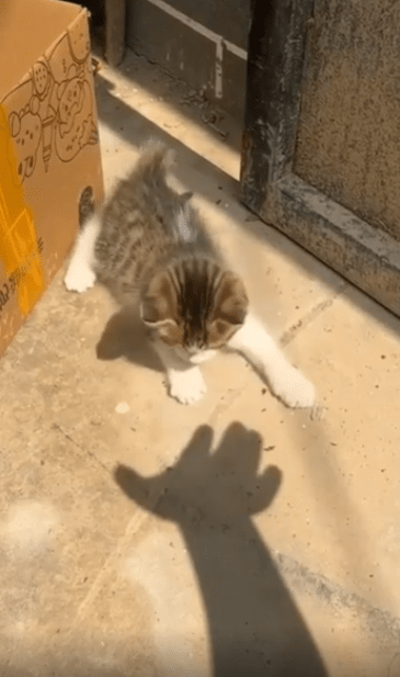햇살이 부드럽게 비치는 방 안, 바닥에 드리운 한 줄기 그림자. 그 그림자는 다름 아닌 사람의 팔 그림자였다. 그런데 그 앞에 선 건, 이제 막 세상을 탐색하기 시작한 어린 고양이. 하얗고 작은 털로 덮인 몸, 반짝이는 눈망울은 마치 ‘이건 뭐지?’라고 묻는 듯 빛나고 있었다.