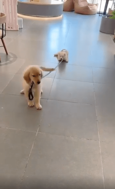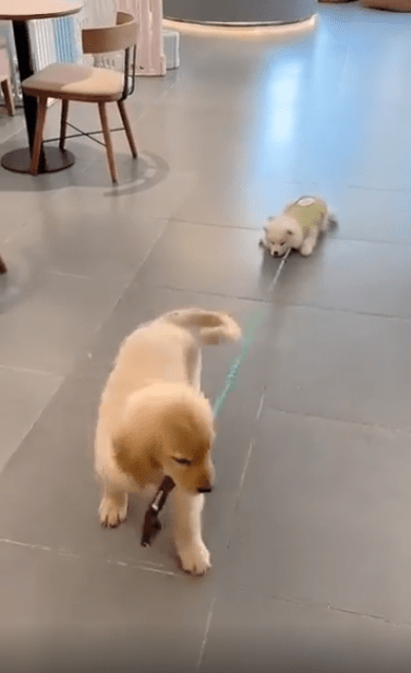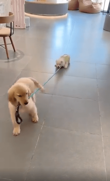 웃음이 터지는 포인트는 바로 이 ‘묘한 현실 부정’의 감정선입니다. 앞 강아지는 절대 멈추지 않고 꾸준히 끌고 나가며, 뒤 강아지는 자포자기한 듯 자신을 운명에 맡깁니다. 두 마리의 크기가 비슷하다는 점에서 이 장면은 더 웃음을 유발합니다. 힘의 차이가 커서 끌려가는 게 아니라, 그저… 의지가 없을 뿐이니까요.