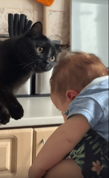 터치를 마친 고양이는 이내 가만히 아기를 바라봅니다. 마치 “좋아, 넌 합격”이라도 말하듯 말이죠. 그 모습은 보는 이에게 미소를 짓게 하는 동시에, 이 조용한 생명 간의 교감에 따뜻한 감정을 불러일으킵니다.