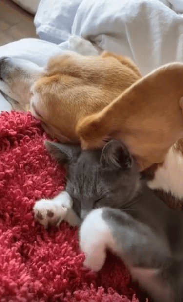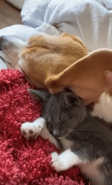 이 작은 고양이에게 강아지의 귀는 단순한 신체 부위가 아니라, 최고의 은신처이자 포근한 베개였던 거죠. 귀 끝의 감촉은 부드럽고 따뜻했고, 무엇보다 그 위에 몸을 기대고 있어도 화내지 않는 큰 존재가 바로 곁에 있다는 것. 그 사실 하나로 고양이는 온전히 마음을 놓고 잠들 수 있었던 듯합니다.