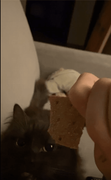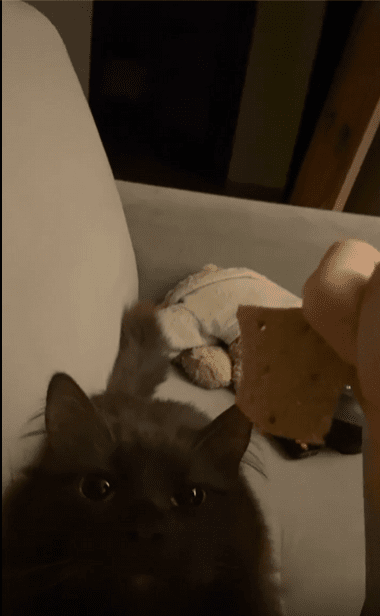 주인의 밀당에 속지 않고 순간포착으로 과자를 낚아챈 고양이의 기막힌 타이밍