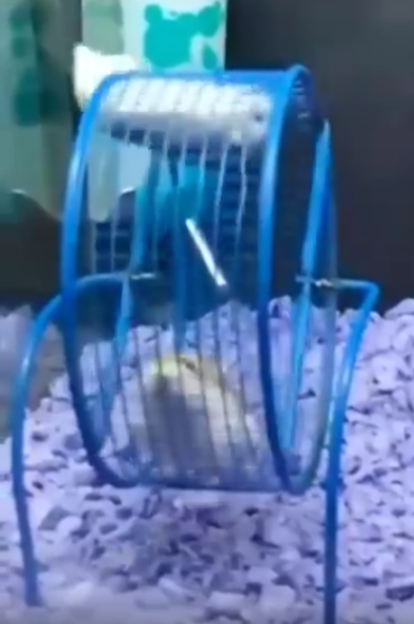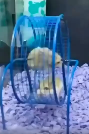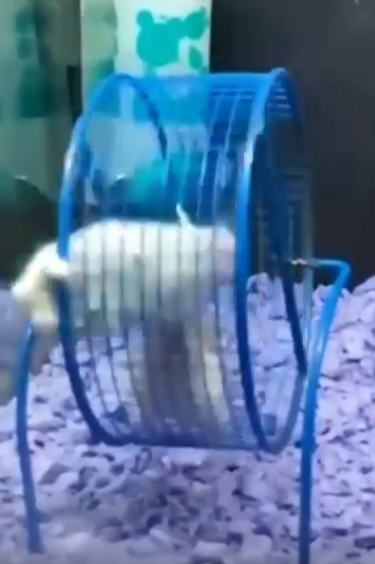 네, 또 다른 한 마리의 햄스터는 회전하는 바퀴 안에 그대로 누워 있습니다. 힘을 빼고 몸을 맡긴 채, 바퀴의 회전에 몸을 실은 모습은 도무지 일어날 생각이 없어 보이죠. 두 햄스터의 대비는 너무나 극적입니다.