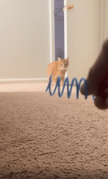 조용했던 방 안, ‘통!’ 하고 울리는 탄성 좋은 스프링 소리 하나. 이 짧고 경쾌한 소리에 누군가의 귀가 쫑긋 섭니다. 어디선가 빠르게 달려오는 소리와 함께 방문을 지나치는 그림자. 그리고 곧바로 등장한 건 회색빛 고양이 한 마리였습니다. 눈은 이미 반짝이며 주인의 손을 응시하고 있었죠.