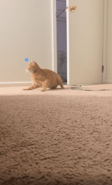 주인은 손에 들고 있던 플라스틱 스프링을 가볍게 고양이 방향으로 튕깁니다. 그 순간, 고양이는 지체 없이 달려듭니다. 허공을 찢듯 뛰어올라 앞발을 쭉 뻗어 스프링을 향해 돌진하는 모습은, 마치 훈련된 포식자가 목표를 노리는 순간처럼 날렵했습니다. 몸을 낮췄다가 쭉 미끄러지듯 튀어나가는 그 움직임에는 장난기와 열정, 그리고 확신이 담겨 있었지요.