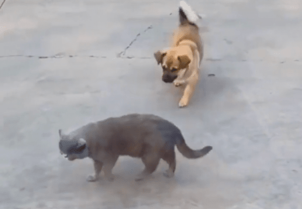 고양이 한 마리가 길을 가고 있습니다. 옆에 있던 개가 고양이를 따라가고 있는데 고양이가 갑자기 뒤를 돌아봅니다. 이에 개는 자기가 따라가는 걸 들키지 않으려는 듯 다른 곳을 바라보며 다리로 귀를 긁기 시작합니다.