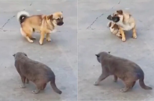 잘못 봤나 싶은지 고양이는 다시 갈 길을 가지만 개도 앞을 보는 고양이 뒤로 쫓아가기 시작합니다. 고양이도 의심하며 계속 돌아보긴 하지만, 증거가 없으니, 개를 잡을 순 없죠.