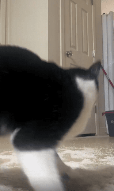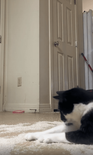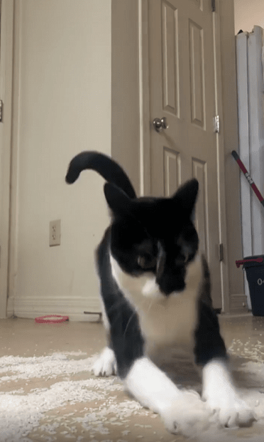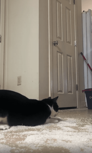 밝은 실내 바닥 위, 무언가가 세차게 흩어져 있습니다. 하얀 알갱이들이 촘촘히 흩뿌려져 있는 그 자리는 다름 아닌 쌀밭, 아니, 쌀이 쏟아진 흔적이죠. 그런데 그 위를 바쁘게 오가는 털복숭이 존재가 하나 있습니다. 고양이입니다. 단단한 발끝으로 사각사각 쌀을 헤집으며 이리저리 휘젓는 모습은 마치 사냥감을 쫓는 야생의 포식자처럼 진지하기까지 합니다.