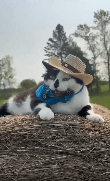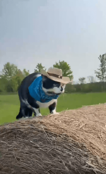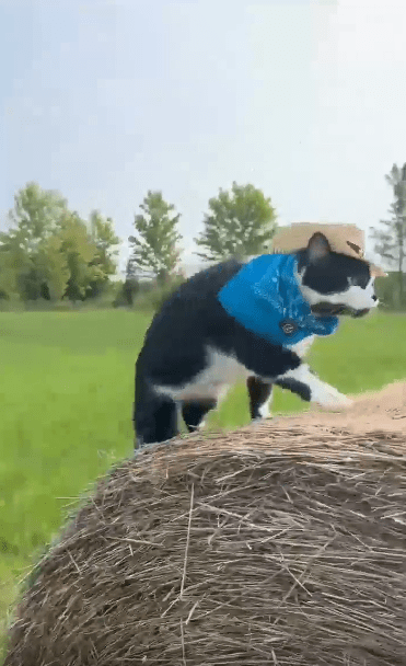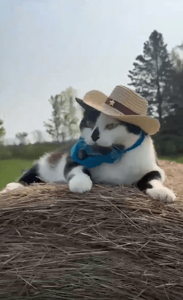 잠시 주변을 둘러보던 고양이는 갑자기 껑충 뛰어올라 볏짚 위에 올라섭니다. 착지할 때 살짝 흔들리지만, 몸을 곧게 세운 채 금세 중심을 잡습니다. 마치 “이곳은 이제 내 구역이다”라고 선언이라도 하듯, 고양이는 몸을 잔뜩 펴고 주변을 둘러보며 당당한 포즈를 취합니다. 시선은 멀리 잔디밭 너머를 향해 있고, 꼬리는 가볍게 좌우로 흔들립니다. 카우보이 모자 아래로 반쯤 감긴 눈에서는 묘하게 진지한 기운마저 느껴지죠.