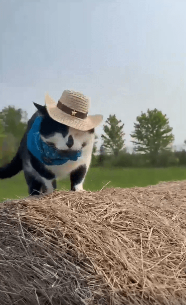 햇살이 따뜻하게 내려앉은 잔디밭, 한쪽에는 볏짚 더미가 소복하게 쌓여 있고 그 주변은 평화롭기만 합니다. 그런데 그 정적을 깨듯, 작고 우뚝한 실루엣 하나가 화면 한가운데로 성큼성큼 걸어옵니다. 카우보이 모자를 쓴 고양이입니다. 딱 맞는 크기의 작은 모자가 귀 위에 얹혀 있고, 고양이의 걸음에는 왠지 모를 자신감이 느껴집니다.