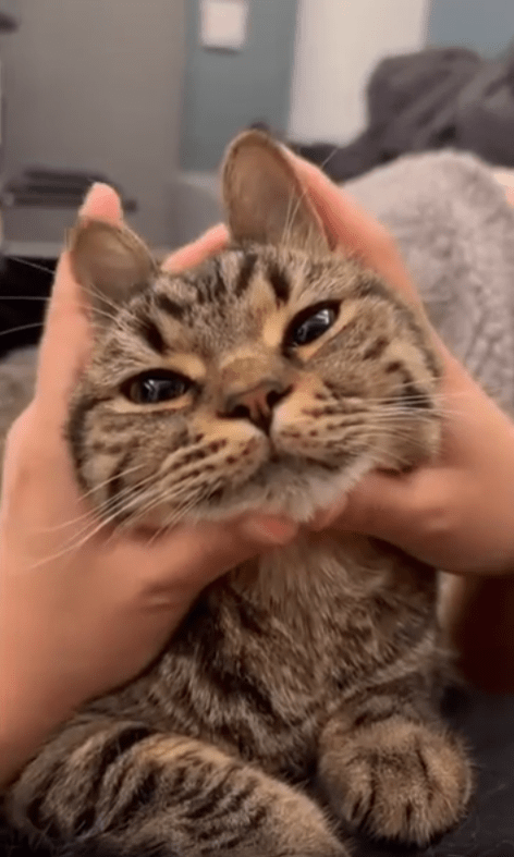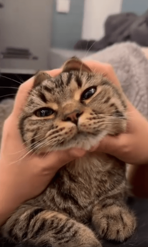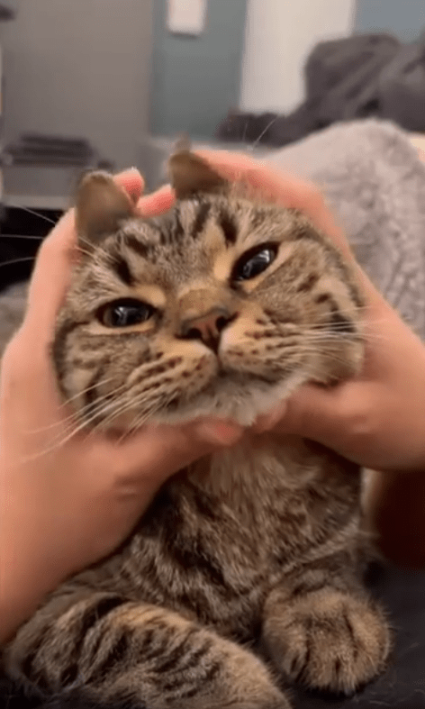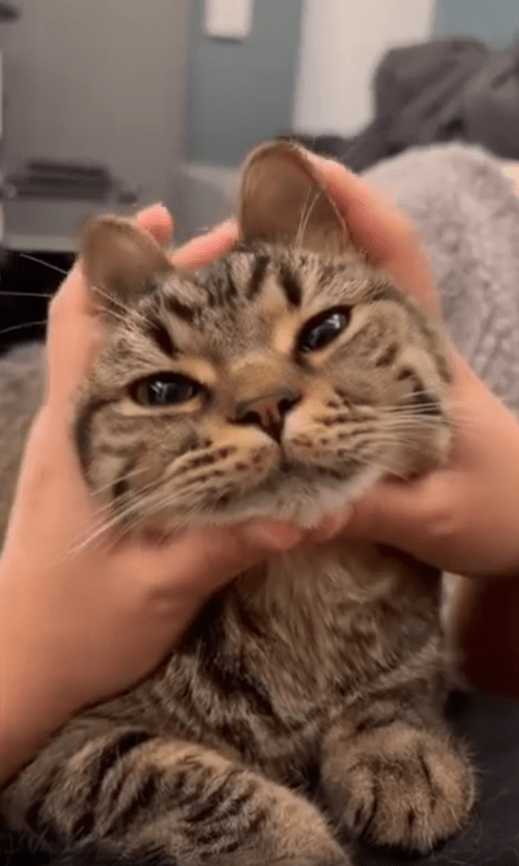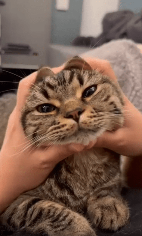 살금살금 다가간 손이 고양이의 얼굴을 부드럽게 감쌉니다. 두 손 안에 폭 안긴 고양이의 얼굴은 포근한 털로 감싸여 있고, 그 위에 얹힌 주인의 검지손가락이 어느새 귀를 향해 움직이기 시작합니다. 한 번 쫑긋, 그리고 다시 펴짐. 그 짧고 반복적인 장난에 고양이는… 아무 반응도 없습니다.