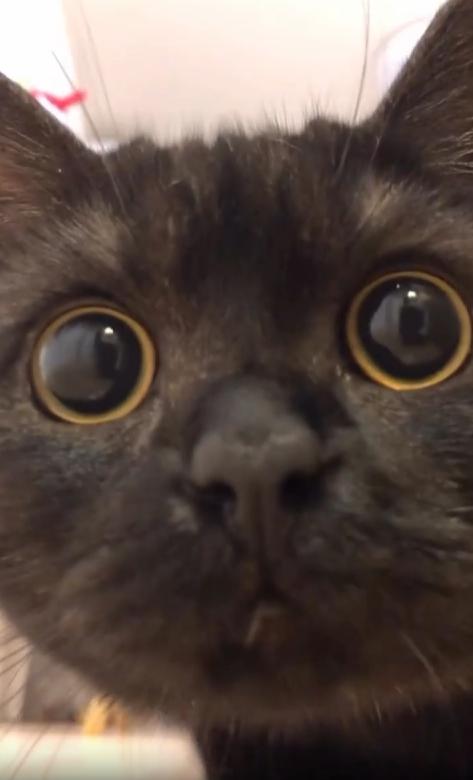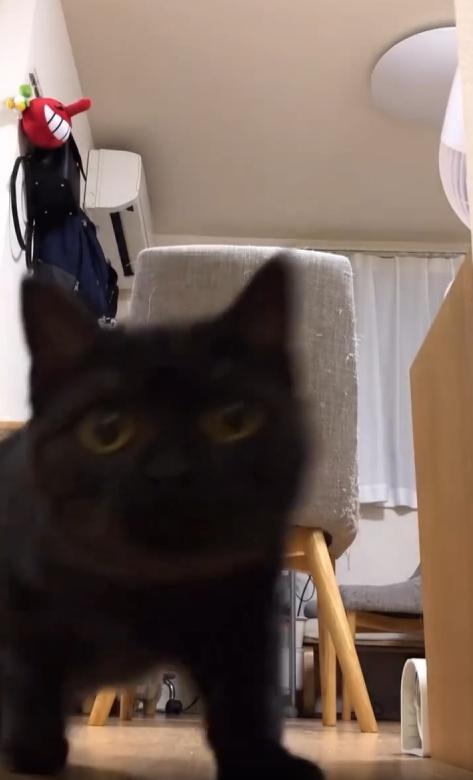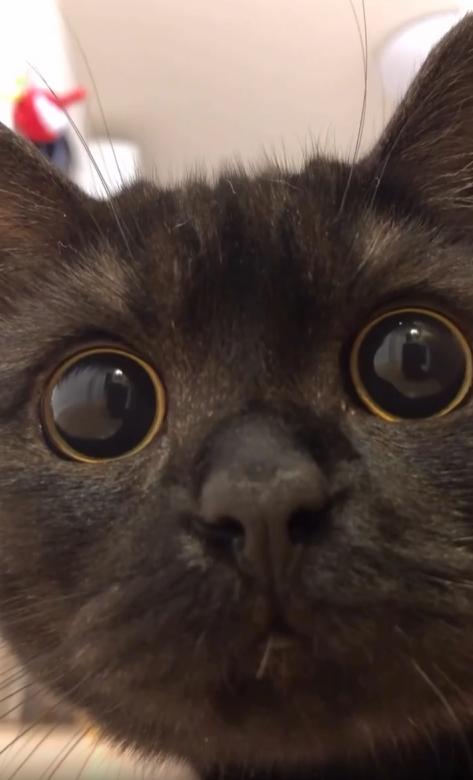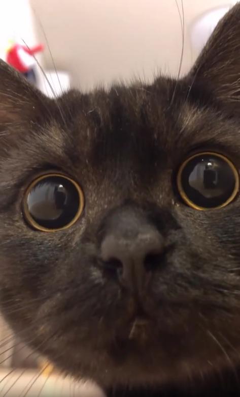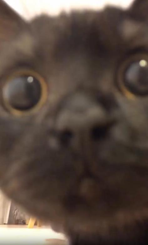 조용한 실내, 아무 일도 일어나지 않을 것 같은 평온한 풍경. 하지만 그 고요함을 깨는 한 순간—멀리서 사뿐사뿐 달려오는 검은 고양이 한 마리. 어둠 속에서 걸어 나오는 듯한 실루엣이 빠르게 다가오더니, 순식간에 화면이 고양이 얼굴로 꽉 찹니다. 화면을 가득 채운 것은 커다랗고 동그란 눈, 그리고 카메라에 거의 닿을 듯 가까운 콧잔등. 마치 우리에게 이렇게 묻는 듯합니다. “지금… 나랑 눈싸움할래?”