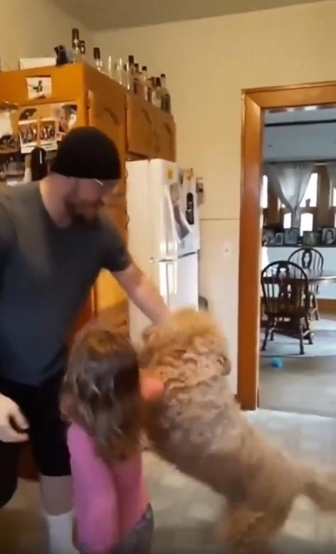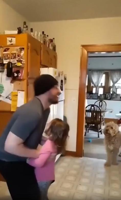 실내 거실, 평화로운 하루의 단편처럼 보이던 장면 속에서 미소가 터진 순간이 찾아왔습니다. 아빠가 사랑스러운 딸아이를 두 팔로 번쩍 들어 올려 하늘 높이 올렸다가 내려놓자, 옆에 있던 커다란 강아지가 그 모습을 유심히 지켜봅니다. 하지만 그 시선엔 묘한 감정이 담겨 있었죠. 단순한 관찰이 아니라, 분명 말하고 있었습니다. “나도! 나도 해줘!”