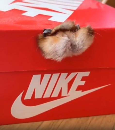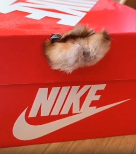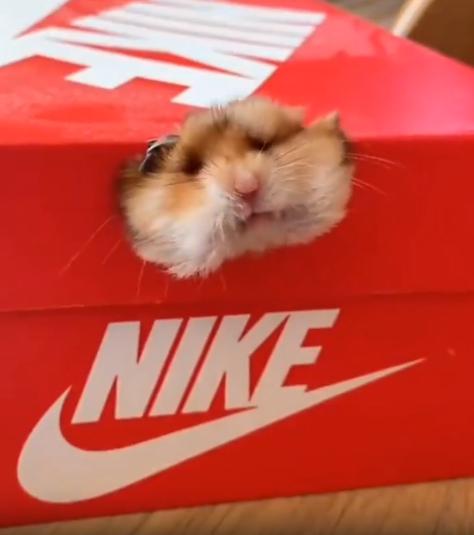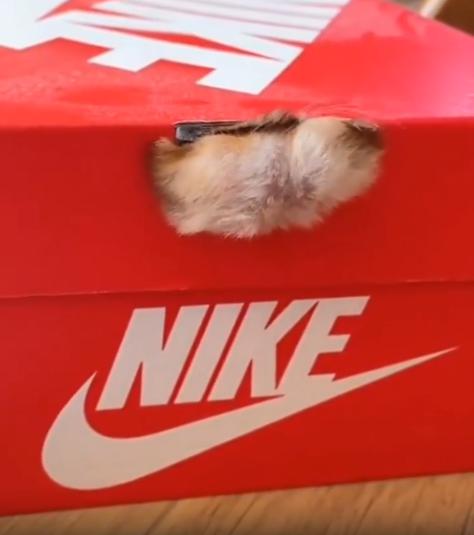 나이키 박스 옆면, 작고 둥근 구멍 하나가 고요함을 깨듯 슬그머니 흔들립니다. 그 속에서 삐죽— 햄스터 한 마리의 얼굴이 등장했어요. 코끝을 씰룩이며 세상을 살피는 그 표정엔 “탐험은 늘 용기에서 시작되는 거야”라는 당찬 각오가 담긴 듯합니다. 구멍 사이로 내민 얼굴은 마치 작전 성공의 신호 같았죠. “해냈다!”는 듯한 자부심이 느껴지기도 했고요.