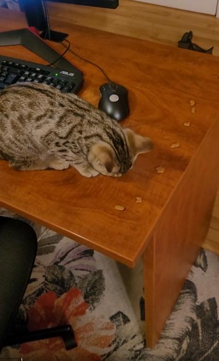 낮은 테이블 위에 간식들이 어지럽게 흩어져 있습니다. 그중 몇 개는 이미 고양이의 앞발 근처에 놓여 있었고, 고양이는 아주 당당하게 간식 하나를 물고는 여유롭게 씹고 있었어요. 턱을 살짝 들고 테이블 위를 어슬렁거리며, 이곳이 마치 자기 식탁이라도 되는 듯한 분위기였죠.