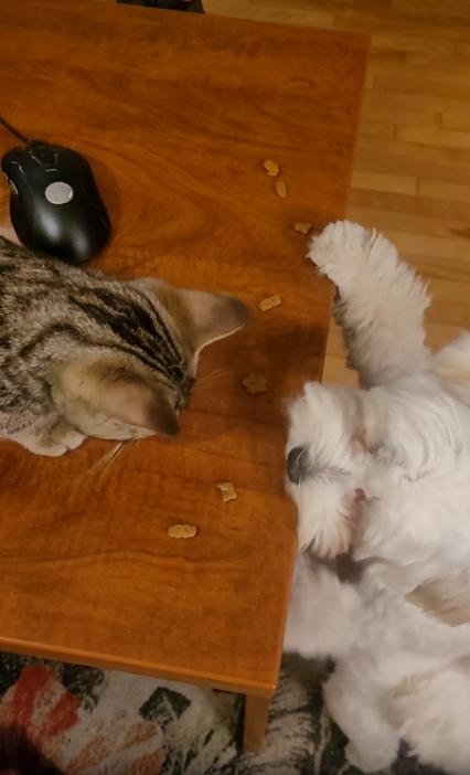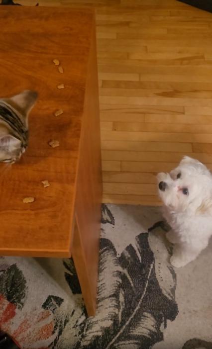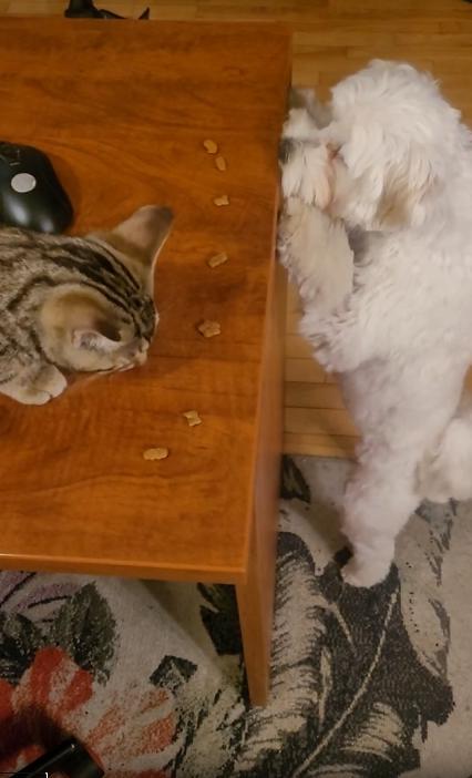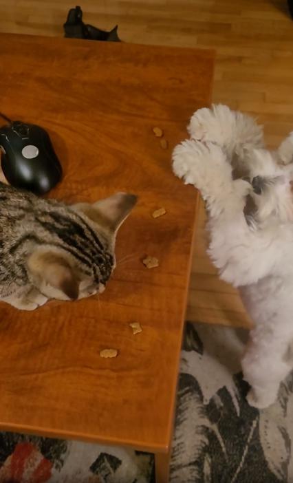 그런데 그 모습을 밑에서 가만히 올려다보던 존재가 있었으니, 바로 강아지였습니다. 호기심과 욕심이 뒤섞인 눈으로 테이블을 올려다보던 강아지는, 어느새 앞발을 벽 삼아 두 발로 일어섰고, 눈 깜짝할 사이에 얼굴을 테이블 위로 쑥! 순간 고양이도 약간 놀란 듯 멈칫했지만, 강아지는 멈추지 않았어요. 바로 앞에 있던 간식 하나를 살짝 집어 입에 넣고는 그대로 내려가버렸죠.