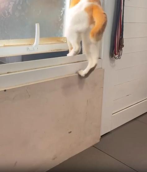딱, 그 순간. 고양이는 한 템포의 망설임도 없이 창문을 앞발로 밀어내며 문을 활짝 엽니다. 손잡이를 위로 당기는 복잡한 동작도, 창문을 밀어 열고 바깥으로 나서는 타이밍도 어찌나 자연스럽고 능숙한지, "혹시 어제도 나갔다 온 거 아니야?" 싶은 의심이 절로 들 정도였죠.