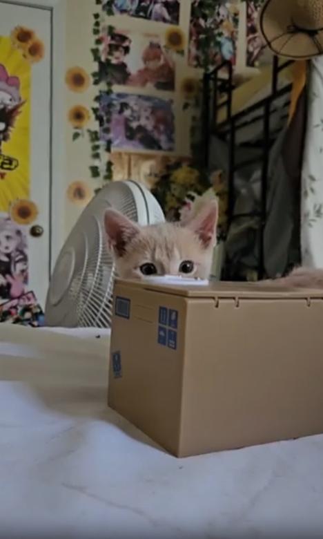 포근한 이불 위, 햇빛이 들이치는 침대 한가운데 장난감 상자가 놓여 있습니다. 박스라기보단 작고 귀여운 미니 사이즈. 그런데 그 상자 앞에 조용히 다가오는 고양이 한 마리. 느릿하게 다가오던 그 고양이는 상자 앞에서 멈춰 선 순간, 눈을 동그랗게 뜨고 얼굴을 바짝 들이댑니다. 고개를 약간 옆으로 기울이며 한쪽 귀를 앞쪽으로 내밀고, 콧잔등이 간질이는 듯 살짝 찡그린 표정이 포착됩니다.