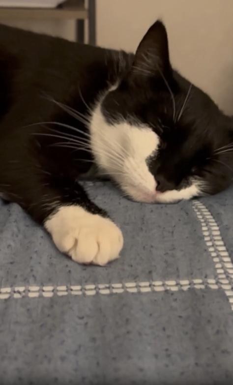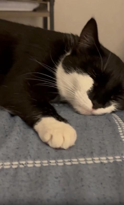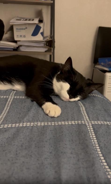 조용한 오후, 햇살이 천천히 침실 안으로 스며듭니다. 창문 옆에 놓인 침대 위, 이불 위에 둥그렇게 누워 있는 고양이 한 마리. 몸은 살짝 옆으로 누운 자세고, 두 앞발은 가지런히 접힌 채 숨결에 맞춰 부드럽게 오르내립니다. 귀는 반쯤 접혀 있고, 눈은 졸린 듯 천천히 감기며 때때로 살짝 뜨였다가 다시 감기는 중입니다.