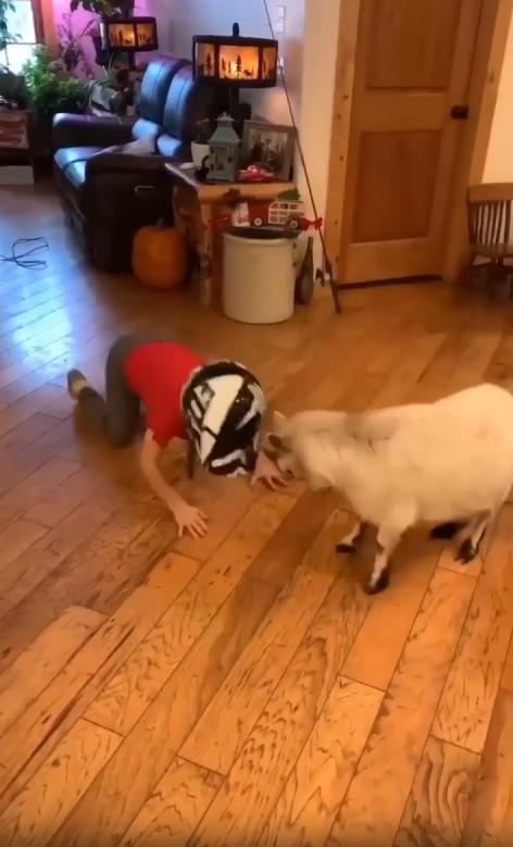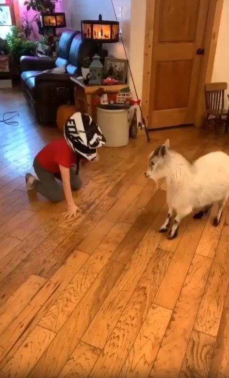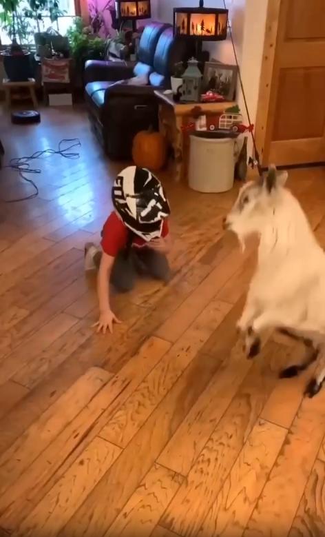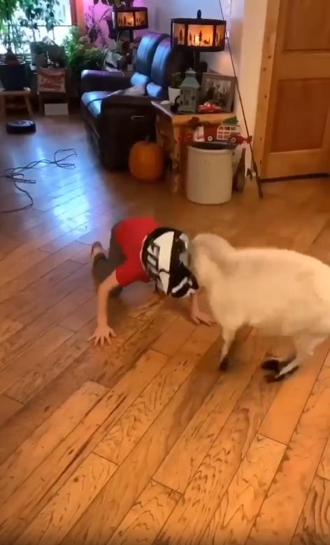 집 안 거실 한가운데서 한 아이가 허리를 숙이고 있습니다. 머리엔 안전모처럼 보이는 검은 헬멧이 단단히 고정되어 있고, 눈빛은 의외로 진지합니다. 아이의 시선 끝에는 작은 염소 한 마리가, 앞다리를 벌리고 머리를 낮춘 자세로 똑같이 마주보고 있죠.