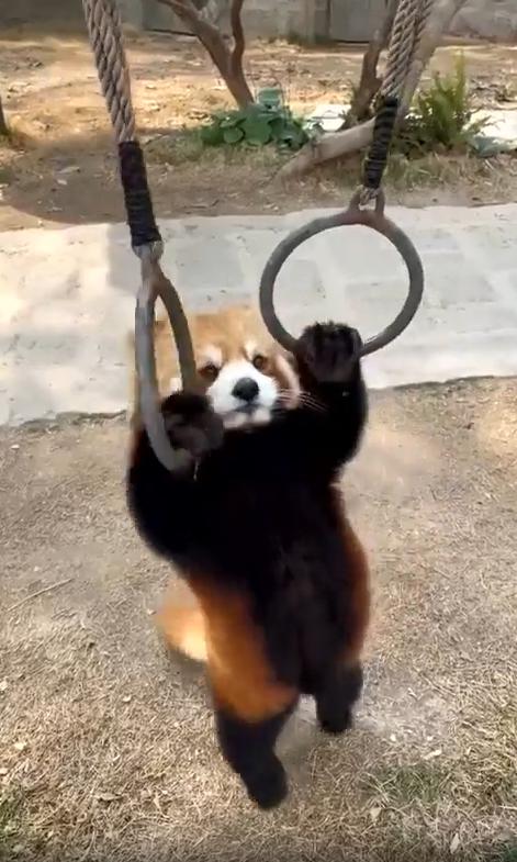 호기심 가득한 눈빛으로 링을 바라보던 레서판다는 앞발을 쭉 뻗어 조심스럽게 링을 움켜쥡니다. 마치 매일 해오던 루틴인 듯 망설임 없이 몸을 들어 올리더니, 어느새 자신의 배 정도 높이까지 올라가 몸을 고정한 채 링 사이를 오르락내리락하기 시작하죠.