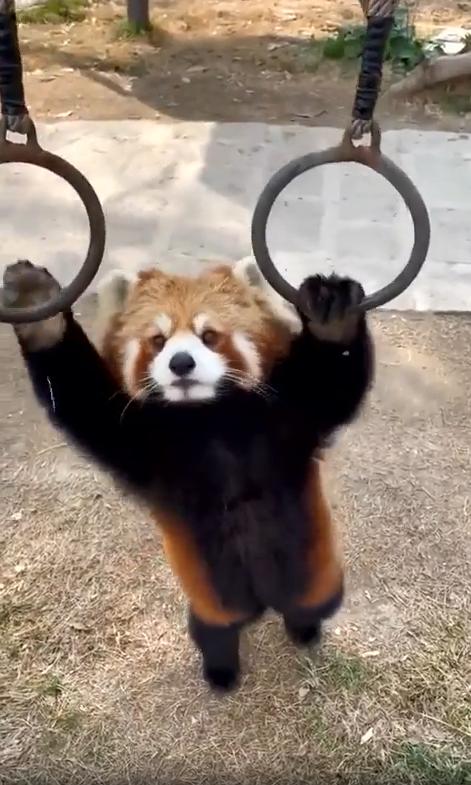 등에 힘이 들어가고, 뒷발은 축 늘어진 채. 레서판다는 몇 번 반복해서 몸을 위로 끌어올리다가 다시 아래로, 그리고 다시 한 번 올라가는 움직임을 보여줍니다. 회전도, 점프도 없지만 묘하게 눈을 뗄 수 없는 장면입니다. 그 작은 팔뚝에 얼마나 힘을 주고 있을까요. 진지하게 링에 매달려 있는 모습에서 어쩐지 운동 중인 우리 모습이 떠오르기도 합니다.