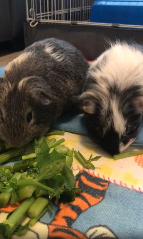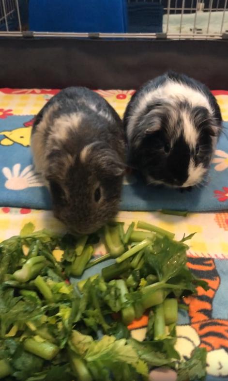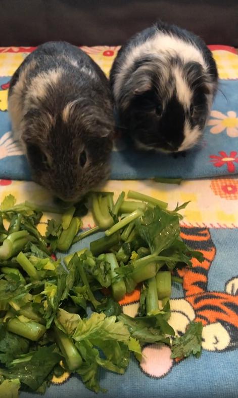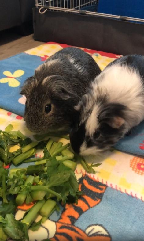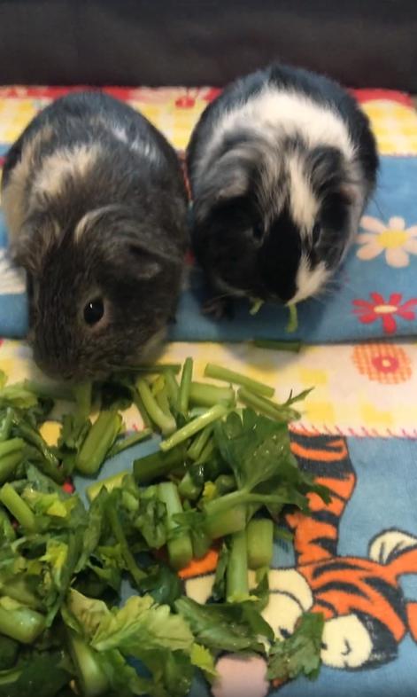 출처 : Reddit /  담요가 깔린 바닥위에 샐러리가 놓여져있고 기니피그 2마리가 샐러리를 먹고있다