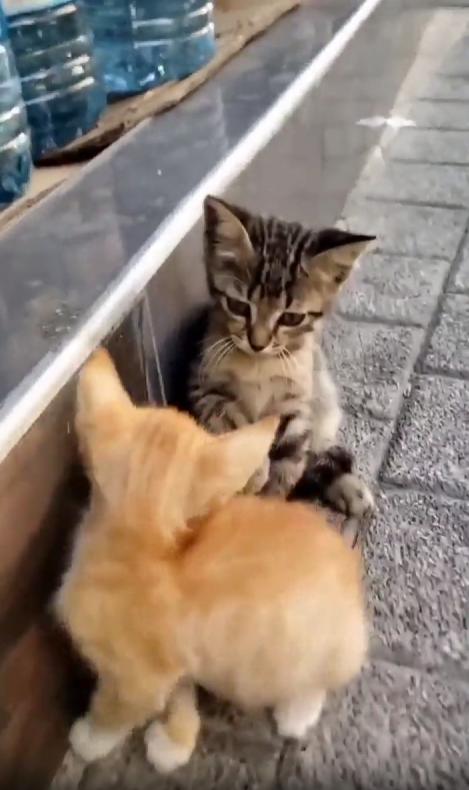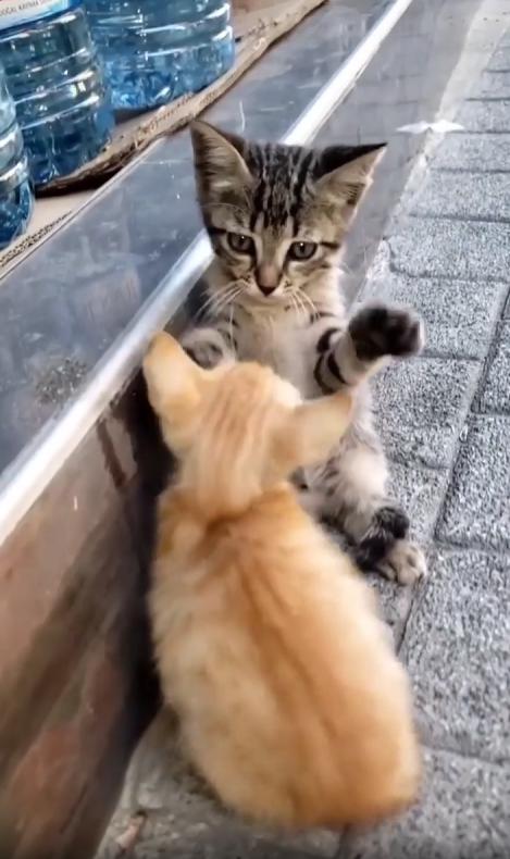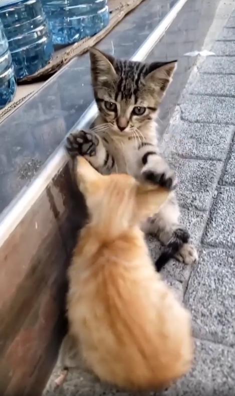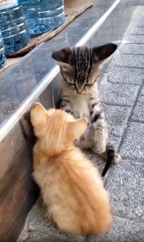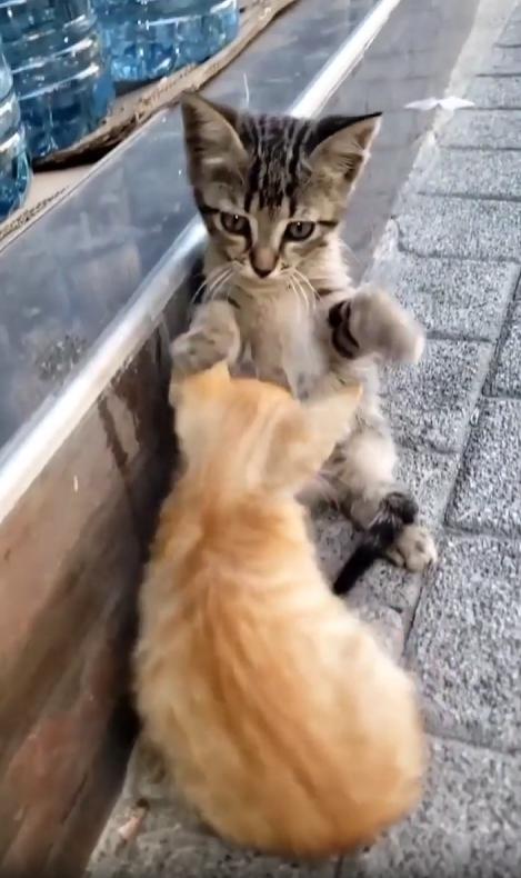 작은 벽면을 따라 놓인 따뜻한 콘크리트 위. 두 마리의 새끼 고양이가 바짝 붙어 앉아 있습니다. 서로 기대다시피 앉은 그 모습은 그저 평온하게 보이지만, 이내 예상치 못한 장면이 펼쳐집니다. 한 고양이가 조용히 옆에 있는 형제 고양이의 머리를 앞발로 “톡” 하고 건드립니다. 순간 움찔하던 상대는 별 반응이 없자, 이번엔 반대쪽 발로 “톡톡”. 그리고 다시 한 번, 마치 드럼 스틱을 번갈아 쥔 듯 리듬감 있게 톡, 톡, 톡. 고양이의 눈빛은 장난스러우면서도 어딘지 진지해 보이기까지 합니다.
