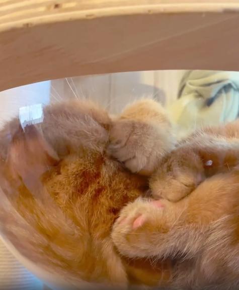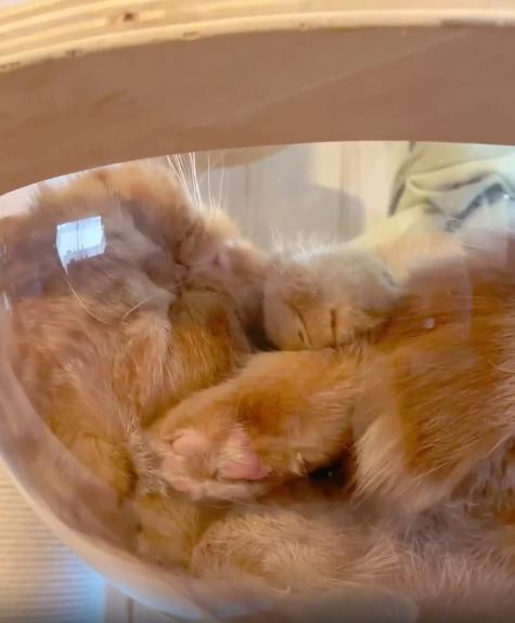 볼의 투명한 곡선 너머로 보이는 고양이의 등과 꼬리는 마치 유리 속 풍경처럼 왜곡되어 보이는데, 그 모습마저 신비롭습니다. 작은 공간에 꼭 맞게 들어가 자신의 온기를 고스란히 전달하고 있는 듯한 그 모습은, 보기만 해도 마음이 따뜻해지는 풍경입니다.