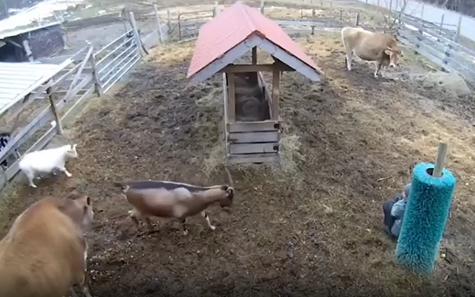 출처 : Reddit / 주인이 걸어와 소용 브러쉬에 기대고 털썩 앉는다. 염소와 소들이 그런 주인을 바라보더니 위로하려는듯 주인에게 다가간다