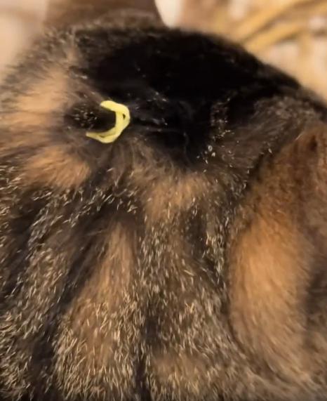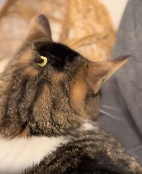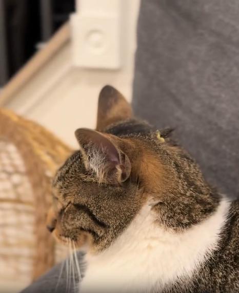 작은 고무줄 하나. 그것만으로 고양이 한 마리가 새로운 분위기를 완성해냈습니다. 화면 속 고양이는 평소와 다를 바 없이 조용히 앉아 있지만, 그 뒤통수 너머로 보이는 건 아주 조그맣게 묶인 머리카락. 뒷머리 부분의 털 몇 가닥이 고무줄에 단정히 묶여 있는 모습은 마치 누군가 정성껏 손질한 스타일처럼 보입니다. 묘하게 귀엽고, 묘하게 우아한 그 모습에 절로 미소가 지어지죠.