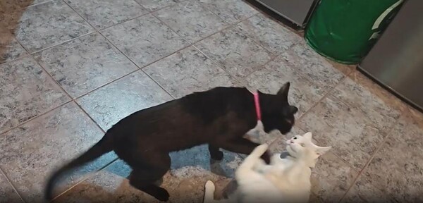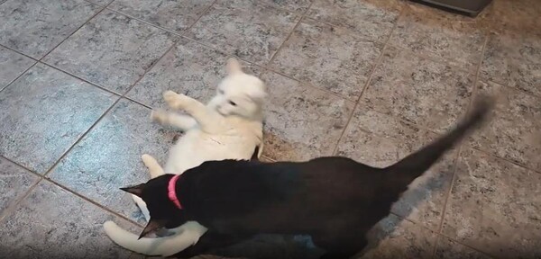 두 고양이 사이에 순간적으로 흐르는 긴장감. 그리고 이내 시작된 첫 펀치. 앞발을 이용해 톡톡, 서로 가볍게 건드리며 시작된 투닥거림은 생각보다 오래 이어졌습니다. 한두 번 치고 마는 장난이 아니라, 몸을 움직이며 계속해서 서로를 쫓고 피하며 반복되는 진지한(?) 몸싸움이었습니다.
